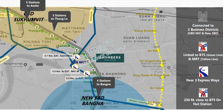 交通機能:230米達BTS Onnut站,往北3站達Thonglor富人區,5站達Asoke重點商業區(可轉乘MRT Sukhumvit站)。 購物休閒:Tesco Lotus、Big C Extra、Century The Movie Plaza Sukhumvit、The Phyll、Onnut Market、Max Valu、Gateway Ekamai、Mega BangNa等 亮點辦公大樓:M Tower、DKSH等。 教育機構:Bangkok Prep國際學校、Wells國際學校、St. Andrews、國際學校、Ekkamai國際學校、Anglo國際學、澳洲國際學校、曼谷大學、Berkeley國際學校等。 醫療院所:Sukhumvit醫院、Samitivej醫院、Kluaynamthai醫院等。Onnut安奴生活圈為西方年輕駐泰人士評價曼谷優質生活圈之一,其便利卻又靜謐的生活環境深受西方人喜愛。DD Property也將安奴站生活圈評價為曼谷最適合居住的生活圈2018)),而其中三大主要原因便是滿足各種消費群需求的飲食選項、多樣化的在地交通方式、國際化的生活圈(來自各國的外派人士居住此區)。近年因商圈發展的擴大,帶動Ekkamai以南BTS沿線的發展,因Onnut位置鄰近重點商業區(Thonglor、Phrom phong、Asoke)且位於Sukhumvit主幹道,來往交通便利,但享有住宅區的舒適及寧靜,保有私人生活的隱私。本區擁有多樣化的餐飲及咖啡店,且有知名大型共享工作空間The Phyll進駐,吸引許多Digit Nomad或是自由工作者選擇此區作為在泰國的居住地。優質舒適的生活圈,生活消費水平相對平易近人,在曼谷都心及大眾交通持續擴張的趨勢下,Onnut站擁有生活以及地理位置的優越性,房市穩定成長,前景看好。