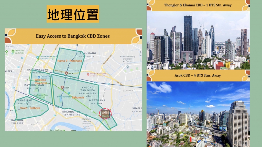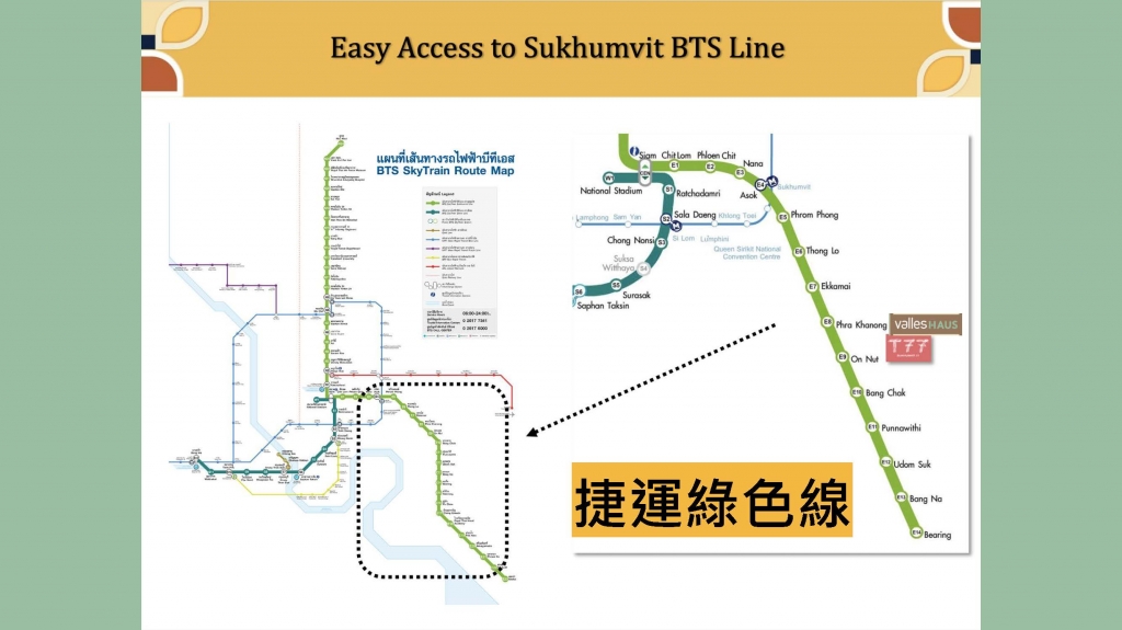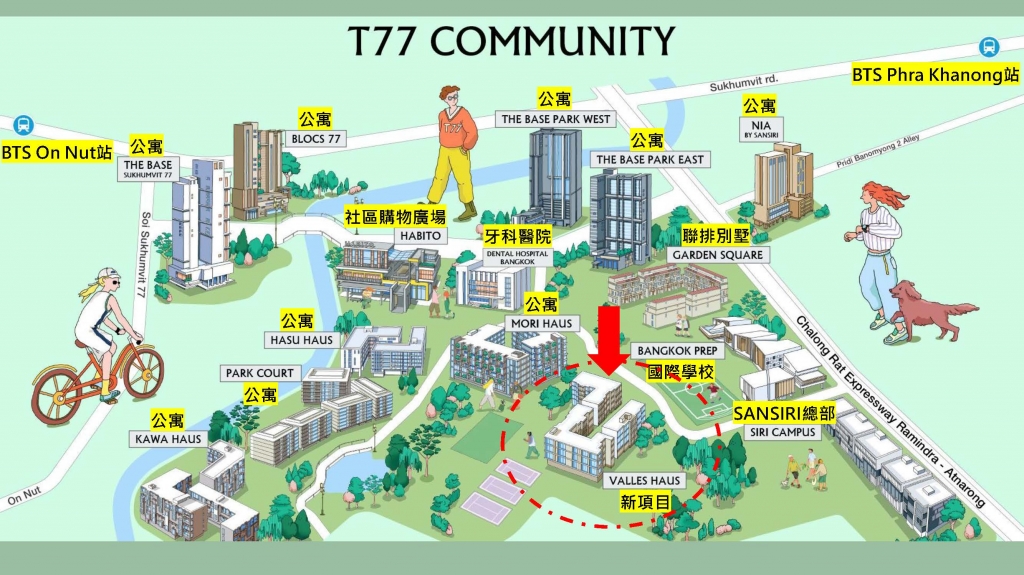 建設名稱 Valles HAUS 地址: Soi Rim Khlong Phra Khanong, Phra Kha Nong Nuea, Vadhana, Bangkok, Thailand 建商: ★ SANSIRI แสนสิริ尚思瑞 為泰國TOP 3開發商,成立於 1984年,打造豪宅起家,「WE CONSTRUCT LIVES, NOT JUST BUILDINGS」尚思瑞打造的不僅只是建築,而是生活質感體現在建案的每一個細節之中,細心也展現在完善的售後服務中。Sansiri(上司睿)為泰國頂級建商,從建造高級別墅到頂級公寓的過程積累30年的經驗,不僅可 以提供精緻的空間設計,更能在細節部分,針對建築的外觀美感或內在功能性,提供絕妙搭 配;這就是Sansiri(上司睿)堅持良久的專業及執著所在。 2021年,Sansiri 榮獲第16屆泰國房地產獎(16th PropertyGuru Thailand Property Awards)Best Developer首獎,此為泰國房地產界的最高榮譽 2021年,Marketeer連續兩年榮獲泰國理想公寓品牌第一名 2023年,連續5年獲得泰國線上領導房產服務平台TERRA BKK " NO.1 TOP OF MIND BRAND "為消費者心中第一名品牌 TERRA BKK 2023年度最具影響力房地產品牌 2023 年 泰國投資者協會 在股東會議管理品質評估項目中,榮獲滿分100分的優異評價 特色: ★ 建案設計靈感源於寧靜山谷,旨在創造一個與大自然和諧共處的居住環境,擁有通透明亮的設計、自然光線充足、溫暖的大地色調 ★ 首個T77社區內,寵物友善HAUS系列(建案C棟);戶外、室內公設、公設會所、寵物公園總面積達2,240 m²,大量綠地面積約2,000 m²提供卓越健康生活 ★ 讓平凡的每一天,都成為「不凡的特別」,valles HAUS 是低棟公寓大廈,設計風格溫馨,坐落於 T77 社區的中心地帶,讓您在繁華都市中享受寧靜的生活,同時兼具便利的交通、優質的環境與高品質的隱藏瑰寶」 建築規劃: 約9,600 m²; 3棟7層低樓電梯住宅、1座2層公設會所, 永久地權 Freehold 單位規劃: 408戶,1房 33.75 - 35.25sqm;1房PLUS 47.75 – 48.25sqm; 2房 61.25 – 62.50sqm; 3房 90.25sqm; 預計年2027 Q1完工 停車場: 224個,約55% 房型規劃: 408戶,1房 33.75 - 35.25sqm;1房PLUS 47.75 – 48.25sqm; 2房 61.25 – 62.50sqm; 3房 90.25sqm 交通: 段機能 T77 社區:一個優質的國際化社區 T77 社區是位於素坤逸區的一個小城,洋溢著國際水準的生活品質。這是一個充滿活力的區域,匯聚了來自不同國家的人們,共同過著高雅且相互尊重的多元生活。 人們渴望居住的區域,T77 社區不僅僅是一個宜居地段,它更是素坤逸地區租賃報酬率成績亮眼的區域之一,滿足以下高品質客群的需求: 外籍家庭、國際學校教師、拉瑪四路-Ekkamai周邊的上班族、追尋生活品質的數位遊牧民族 (Digital Nomads)。T77社區不僅僅是個居所,更是「優質資產」,能同時實現生活與投資的雙重成長。 td>