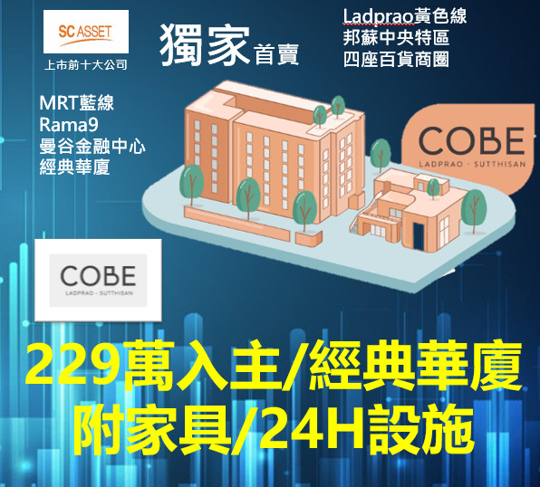 建設名稱 COBE Ladprao – Sutthisan 地址: Soi Lat Phrao 64, Wang Thonglang Subdistrict, Wang Thonglang District. Bangkok 10310 建商: ★ SC ASSET 成立於1989年,2003年登記為上市公司。早期建造節能科技辦公樓聞名於業界,2002年起將事業版圖拓展並聚焦於住宅開發,涵蓋各種住宅項目(連棟、別墅、社區、公寓大樓等)以符合不同生活風格族群之需求,同時持續將科技應用在住宅環境與生活空間,期盼打造機能性、友善環境之生活。為貼近智慧生活的趨勢,SC ASSET更與泰國電信公司AIS團隊攜手合作開發生活智慧應用軟件「Baan Ruejai」,一手掌握生活大小事。 在 2024 年於泰國國內外共榮獲七大平台的獎項,再次印證其在房地產領域的領先地位。經紀業:德寶地產股份有限公司 加盟經營者:21 世紀不動產忠孝光復加盟店 經紀人: (102)新北經字第 002739 葉珮孜 風險警語:國外不動產投資,具有風險性,請投資人詳閱行銷文件並審慎考量後再行交易。 製表日期 : 2025/08/25 包含但不限於以下,卓越品牌與客戶信任獎項:TERRAHINT Brand Series 2024 Happiness Hero Award:表彰其出色的售後服務。TERRA BKK 客戶調查:2024 年最受推薦房地產品牌:顯示其深受客戶信賴。BCI Asia 2024 亞太地區十大開發商:泰國十大開發商:肯定其在業界的領先地位Bangkok International Branding Festival 2024:2024 泰國品牌超級粉絲前三名、2024 房地產領域最具未來價值品牌 特色: ★ 建案擁有設置社區商店,以『CO-BEING COMMUNITY』為理念,打造SC ASSET旗下COBE品牌專為追求思想自由、同時也關懷社會與環境的生活方式而設計; 在 COBE Ladprao – Sutthisan,提供功能齊全、實用的公共區域 ★ 交通便利,600m至MRT黃線 Chokchai 4地鐵站,靠近Lat Phrao – Ratchada地區的購物中心、美食勝地和社區中心;項目周圍遍布Chokchai 4地區的餐廳、咖啡館和市場,您可以享受24小時便利服務 ★ 建案連接Sutthisan路,並連接通往商業區的主幹道;靠近Rama 9工作區,包括金融機構、辦公大樓和商務中心 ★ 24小時工作與生活平衡,盡在COBE Ladprao – Sutthisan,建案靠近各種便利設施,無論是想工作、購物或休閒,都能在此輕鬆切換,滿足全天候生活方式 建築規劃: 3棟8層樓 電梯大樓 ,2027完工,基地面積 約8,237平方米 ,永久權Freehold 單位規劃: 3棟8層樓 電梯大樓, 共690戶 ,停車位 223個,約32%. 684戶-住宅單位,A棟-233戶;6戶商業單位; B棟-209戶; C棟-242戶單位戶數 停車場: 停車位共223個約32% 房型規劃: 1床 FLEX 24 -25 sqm, 1房 SIGNATURE 27 – 30sqm, 1房PLUS 34 – 37sqm,2房 45sqm,