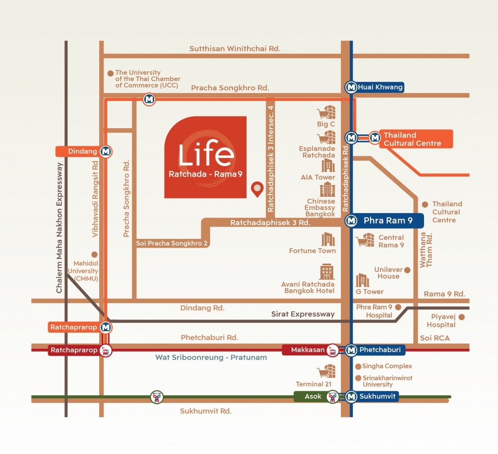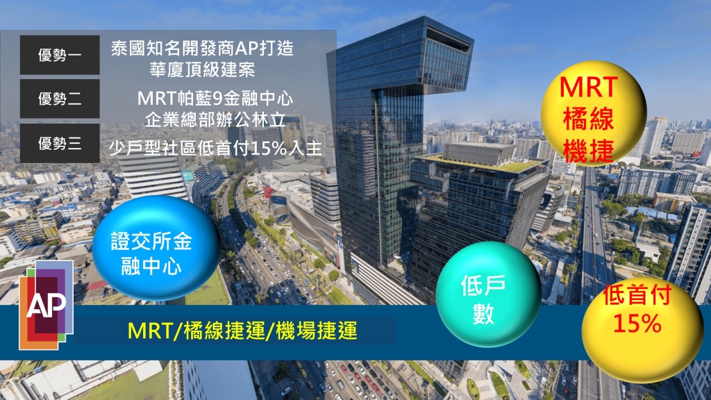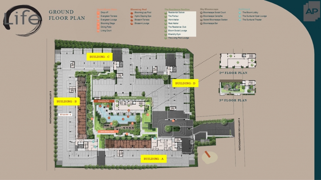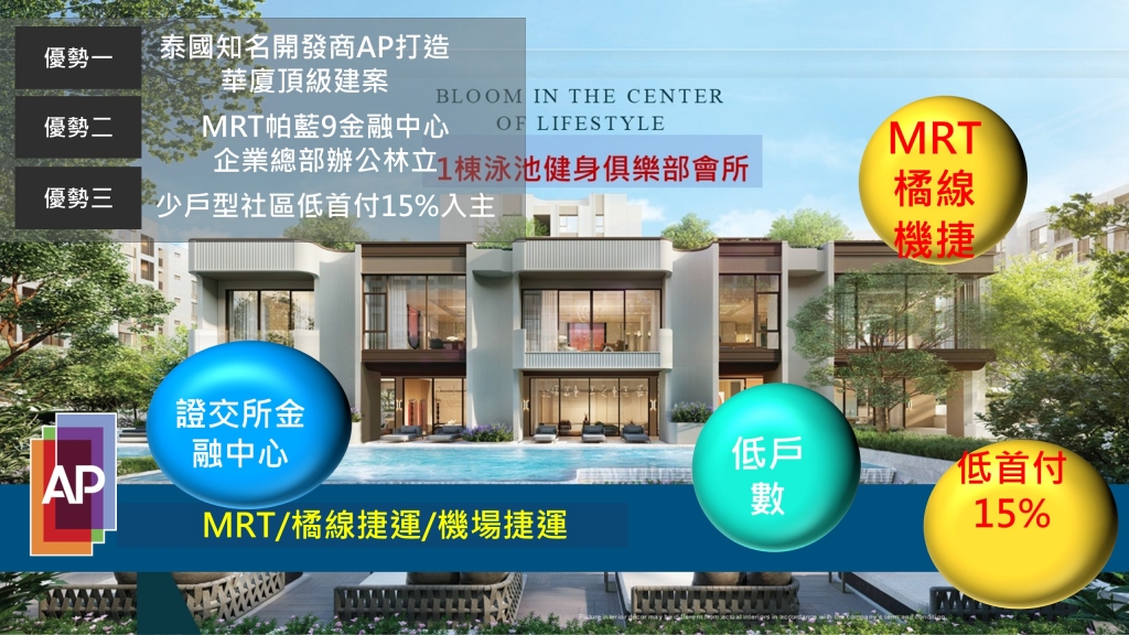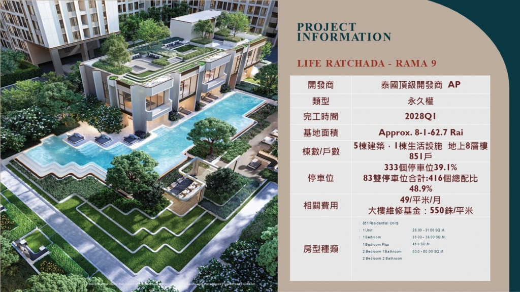 建設名稱 LIFE Ratchada-Rama9 地址: Soi Yu Charoen, Ratchadaphisek Road, Din Daeng Sub-district, Din Daeng District, Bangkok 建商: ★ AP (Thailand) Public Company Limited 1991年成立,於1992年即上市SET (The Stock Exchange of Thailand 泰國證券交易所),為泰國上市領導房地產開發商,長年排名前十名的公司,提供廣泛的住宅產品,包括聯排別墅、獨立住宅、半獨立住宅和電梯公寓。建案選址於便利生活區、靠近中央商務區,使居民可以輕鬆前往目的地。隨著需求不同,致力提供符合每個社區獨特的優質設計。除了精選地點外,建商亦專注於市場消費者的需求,顧及位置、社區、個人生活方式,為客戶呈現最佳物業、價格範圍、品牌和風格。 得獎紀錄: ◆連續 7 年蟬聯「最受推崇品牌」: 榮獲 2025 Thailand’s Most Admired Brand 第一名。泰國本地人心目中,AP 是品質、設計與售後服務的「首選品牌」 ◆日本 GOOD DESIGN AWARD 2025 雙項大獎: RHYTHM Ekkamai Estate 與 LIFE Sathorn Sierra 獲得日本最權威的設計獎項肯定。這證明了 AP 的公設美學與綠化空間已達到「日系精工」等級的國際認可 ◆2025 橫掃 40 項國內外大獎:在 PropertyGuru Thailand Property Awards 2025 中,AP 獲得了「最佳住宅開發」與「最佳社區建築設計」等多項金獎 ◆SET 永續企業認證: 身為上市公司,AP 在 2025 年再度入選 SET ESG Ratings (AAA 等級) 特色: ★ 泰國房地產領導品牌 AP Thailand 2026年全新打造。AP 在 2025 年橫掃 40 項國際大獎,並連續 7 年榮獲「泰國最受推崇品牌」 ★ 感受靜謐新定義——自然與建築的完美融合,專為極致放鬆而生。 Life Ratchada – Rama 9 AP Thailand 全新低密度精品公寓,坐落於曼谷新 CBD 心臟地帶;位於曼谷最具活力的經濟中心,鄰近 MRT Phra Ram 9(藍線)站僅約 750 公尺(2分鐘車程),且能快速連結機場快線(ARL)及未來四線捷運路網。 ★ 緊鄰拉差達大馬路僅 300 公尺,步行即可抵達 Central Rama 9、Fortune Town 及 Unilever House 等 A 級商辦,具備強大的商業剛需 ★ 「Life in Bloom」在高樓林立的 Rama 9 區域,罕見規劃為 4 棟 8 層樓住宅,總戶數851 戶,創造彈性舒適的居住感。 ★ 精緻公設美學,Bloom & Sunburst在繁忙的都市中心提供如度假村般的氛圍 建築規劃: 約13,460 sqm基地面積 ,A、B、C、D棟共4棟8樓永久地權電梯住宅 + E棟地上3層地下1層公設建築. 開發商AP ME 30 Co., Ltd. 單位規劃: 851戶~1房 28 – 31 sqm, 1房 PLUS 35 - 38sqm, 2房1衛 45sqm, 2房2衛50 – 60sqm 停車場: 416個,約48.9% 房型規劃: 居住單位 1房 28 – 31 sqm, 1房 PLUS 35 - 38sqm, 2房1衛 45sqm, 2房2衛50 – 60sqm